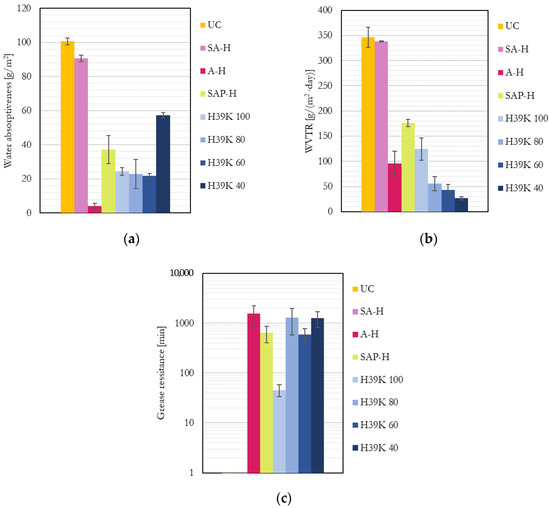 Barrier properties for the uncoated (UC), commercial (SA-H, A-H, and SAP-H), and experimental dispersion coatings: (a) Water absorptiveness; (b) Water vapor transmission rate; (c) Grease permeability (UC and SA-H are not visible since they resist <1 min). The values for the experimental formulations were taken from Marinelli et al. [7].