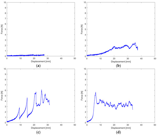 Typical Force-Displacement tensile test curves of the heat-sealed samples: (a) Negligible seal; (b) Adhesive separation of the sealed sample, occurring at the coat-coat interface; (c) Inhomogeneous seal, with peaks highlighting decently sealed areas; (d) Cohesive failure of the substrate, substrate delamination.