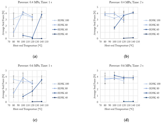 Effect of the investigated parameters (i.e., temperature, time, and pressure) on average seal force for commercial grade-coated samples: (a) Pressure = 0.4 MPa, time = 1 s; (b) Pressure = 0.4 MPa, time = 2 s; (c) Pressure = 0.6 MPa, time = 1 s; (d) Pressure = 0.6 MPa, time = 2 s.