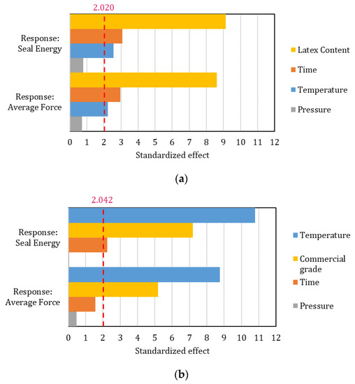 Linear Pareto chart for the standardized effect of the considered factors. Both seal energy and average force responses are reported in each graph: (a) Experimental formulations; (b) Commercial grades. The dashed line represents the reference line above which the effect of the factors is statistically significant.