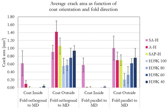 Nevertheless, the method was sufficiently accurate to clearly highlight the role of fold direction and coating orientation. The anisotropy of the substrate affected crack formation severity. The different behavior can be attributed to the bending stiffness along the fold line, which depends on both substrate thickness and fiber orientation, as supported by previous literature [19,20,30]. Instead, when referring to the coat orientation, being outside means that the coating is subjected to tensile stresses; on the contrary, if placed on the inside, the stress may be generally regarded as compression [19]. Given the reduction in the crack area with the folding line is parallel to MD, and on a much more important reduction in crack area when the coat is placed on the inside rather than on the outside (Figure 7), a brittle behavior of the coating may be pointed out.