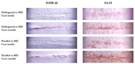 For each condition and coating, 12 samples were folded, and pictures were acquired at constant magnification (120×). Finally, the images were processed with ImageJ v1.53e to measure the stained area (in pixels) over a length of 5.5 mm for each sample.