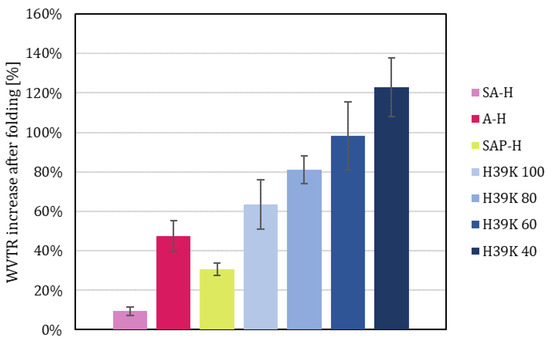 The effect of folding on WVTR led to an increased moisture transmission rate. The extent of such an increase was different for each coating (Figure 11), depending on the original barriers. Indeed, the lower the unfolded WVTR, the higher the effect of fold cracks, showing a Pearson correlation of −0.793 (p = 0.000). The highest increase was obtained for H39K 40, which doubled in value, whereas SA-H, due to the cracked surface (Figure 9e), showed little variation. The Pearson correlation factor between the unfolded and folded samples was 0.998 (p = 0.000). Such results highlight how, in line with the equivalent fold cracking area (Figure 7), each sample was affected by crack formation. Thus, avoiding defects in the processing of the material is crucial.