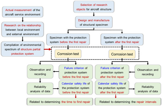 The calendar safety life of the surface protection system in an aircraft structure is the time limit for its use without functional failure at a certain level of reliability and confidence [1]. Our research is focused on the force-bearing components of aircraft structures, and the main object of our research is the metallic structures and coating systems for aircraft surfaces. For critical structures affecting flight safety, and for structures with particularly poor corrosion resistance regarding the substrate materials (e.g., landing gear), the calendar safety life of protection systems should be selected at a high level of reliability and confidence based on the safety of their use [2]. For other aircraft structures, since it still takes a certain amount of time for the corrosion failure of the structural substrate to occur after the failure of the protection system, structural safety, overhaul time, and repair costs, among other factors, should be considered comprehensively [3]. Repair costs and other factors should be considered from an economical point of view to determine the reliability and confidence of the protection system [4]. Therefore, the calendar safety life of the protection system for these structures is mainly related to the use of economics [5].