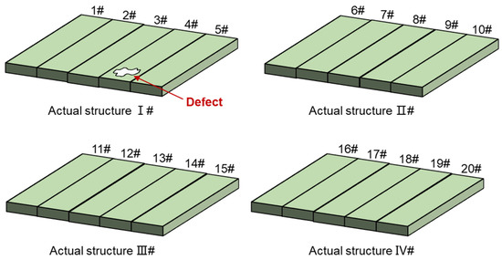 Figure 2 features four pieces of actual structure, with serial numbers from I# to IV#. Assuming that the surface area of the actual structure is five times that of the specimens, the sum of the surface area of the four pieces of the actual structure is equivalent to the surface area of 20 specimens. The serial numbers for the specimens are 1# to 20#. Then, it is assumed that the calendar safety life of the actual structure surface protection system is 10 years, and the reliability of the calendar safety life is 75%. This means that when four structures are in service/use for 10 years, about 4 × (1%–75%) = 1 structure surface protection system failure occurs, such as the defect in the I# structure. From a safety perspective, for a sample capacity of 4 × 5 = 20 specimen samples, when the calendar safety life of the protection system is 10 years, at most one specimen of the surface protection system is still required to fail, such as the defect in the 4# specimen. Then, the specimen surface protection system calendar safety life reliability is (20 − 1)/20 = 95%. It can be seen that, because the surface area of the specimen is smaller than the actual structure, the reliability of the specimen surface protection system calendar safety life is obviously greater than the actual structure. The analysis results obtained from the test data, based on the above reliability, can be used as the calendar safety life of the protection system for the actual structure at a reliability of α. With the obtained test results and the given reliability, the calendar safety life of the structural protection system should be determined by first determining the distribution of the calendar safety life of the protection system. Then, the calendar safety life value that satisfies the given reliability and confidence levels according to the probability density function of the determined distribution were obtained. Since there is a general method for determining the form of the distribution and calculating the reliability value, it is not repeated here.