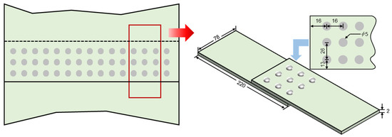 A schematic diagram of the connection parts in the aircraft structure is shown in the left half of Figure 3. The structural connection form is a single-sided rivet lap type. The upper and lower wall panels are connected by three rows of semi-circular head rivets, and the number of rivets used for the connection between the two adjacent partition frames is 54 × 3. The thickness of the wall plate is 2 mm, and the material is 7B04 aluminum alloy. The rivet diameter is 5 mm, and the material is 2024-T4 aluminum alloy. The load direction for the structure is vertical in Figure 3. According to the characteristics of the hypothetical structure, the designed structural simulation specimen adopts the form of a multi-rivet lap, and the specimen is a single-sided lap riveted by semi-circular head rivets. The lap plate is attached according to the rolling direction. The protective layer on the surface of the specimen is epoxy primer. The configuration dimensions for the specimen are shown in the right half of Figure 3.