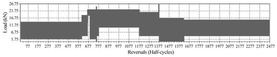 The type of load spectrum used in this paper is the program block spectrum, the specific values are shown in Table 1, and the specific loading history is shown in Figure 4, with one spectrum block for every 1239 cycles [32]. The fatigue test loading equipment is an MTS-810-500 kN fatigue testing machine, the loading frequency is 15 Hz, and the test loading dynamic load error is less than 1% of the maximum load [32].