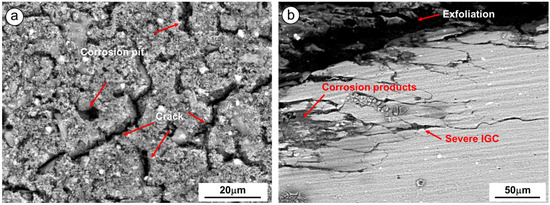 Alternating tests on the specimens for corrosion and fatigue were carried out. Four specimens were subjected to a pure fatigue test. The corrosion fatigue alternating test was divided into five groups. The total corrosion time was 325 h, 975 h, 1300 h, 1625 h, and 1950 h, and there were four specimens in each group. The test sequence for the five groups in the corrosion fatigue alternating test is in the form of “corrosion–fatigue–corrosion–fatigue”, that is, a twice alternating corrosion fatigue test. The corrosion time per corrosion and the number of cycles in the first fatigue loading are shown in Table 2. The specimen is loaded directly onto the fracture during the second fatigue load. Table 3 shows the failure time of the protection system for 16 specimens. Figure 5 shows the microscopic morphology for the failed part of the coating. As can be seen from the figure, the coating failure has produced many cracks and pits on the surface, allowing corrosive media to penetrate through the surface defects. From the sectional point of view, the coating has been spalled and the metal has been eroded by the corrosive medium, and severe intergranular corrosion (IGC) has occurred.