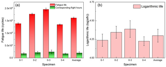 Results of the fatigue test: (a) fatigue life and corresponding flight hours; (b) logarithmic life.
