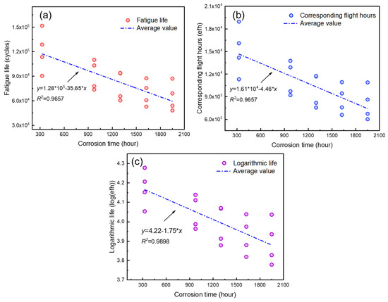 Results of the corrosion fatigue alternation test: (a) fatigue life; (b) corresponding flight hours; (c) logarithmic life.