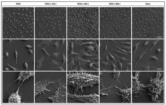 Scanning electron microscopy (SEM) images show L929 cells culture for 72 h on PEEK matrices treated with treated for 120, 240, and 480 s and glass microscopic slides. SEM images at three different magnifications. Reprinted with permission from ref. [25]. Copyright 2015 RSC.