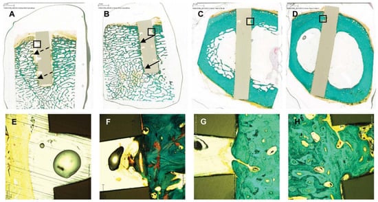 The tissue growth around untreated PEEK (A,E), ANAB-treated PEEK (B,F) in the cancellous bone at 4 weeks and untreated PEEK (C,G), and ANAB-treated PEEK (D,H) in the cortical bone at 12 weeks. Reprinted with permission from ref. [33]. Copyright 2017 Wiley.