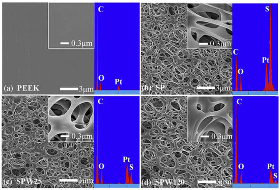 SEM and EDS images of PEEK treated with different concentrations of sulfuric acid. Reprinted with permission from ref. [38]. Copyright 2016 Elsevier.