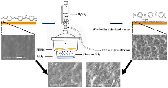 Recent studies have improved the sulfonation procedure to achieve better surface modification. Wan et al. [43] developed a new controllable sulfonation method using gaseous sulfur trioxide (SO3) fumigation to form a micro-topological porous structure with –SO3H component incorporated simultaneously. The schematic diagram is shown in Figure 5. Moreover, different degrees of modification could be achieved with a 6–14 mm pore diameter by controlling fumigation time. SO3-fumigated PEEK has enhanced hydrophilicity, cytocompatibility, protein absorption ability, and mineral apatite deposition capacity. Further, SO3-fumigated PEEK could significantly improve the adhesive and proliferation abilities of cells and extracellular matrix (ECM) secretion. Compared to the traditional sulfonation method, this technique introduces fewer changes in the structure. It could retain a certain degree of the mechanical properties of PEEK material since the pores formed by fumigation were significantly smaller and more uniform. Hence, the antibacterial and biological activity of this modified technique should be investigated in vivo.