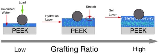 Liu et al. [48] grafted poly (sodium vinylsulfonate) using UV radiation, and an increase in the amount of homogeneously distributed poly (sodium vinylsulfonate) grafted on the surface was observed with an increase in exposure time. Further, no changes in the inherent mechanical properties, enhanced hydrophilicity, and in vitro mineralizing ability of PEEK were observed after grafting. Additionally, an enhancement in the adhesive and proliferative ability, ECM secretion, and osteo-differentiation of MC3T3-E1 cells treated with increasing amounts of grafts was observed. Zhao et al. [49] grafted acrylic acid (AA) on PEEK using UV irradiation and demonstrated similar results. In addition, the hydration layer reduced the direct contact between two sliding surfaces and decreased the friction coefficient to 0.021, thereby improving bearing capacity and reducing the abrasion of PEEK. Figure 6 shows the mechanism.