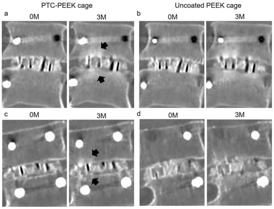 Micro-CT analysis of bone formation in the vertebral fusion area after 12 weeks of implantation. Images of the PEEK cage and Ti-coated PEEK cage are shown. (a,b) Case 1; a 43-year-old male with L4-5 lumbar disc hernia. (c,d) Case 2; A 71-year-old female with lumbar degenerative spondylolisthesis. Black arrows indicate cancellous condensation. Left panel, immediately postoperatively (0M). Right panel, 3 months postoperatively (3M). Reprinted with permission from ref. [68]. Copyright 2020 Elsevier.
