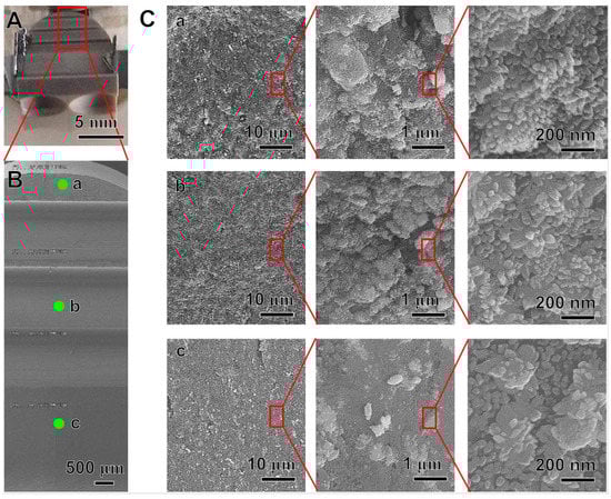 Macroscopic and SEM images show a TiO2-coated PEEK cage. (A) Macroscopic view. (B) SEM image (C) Magnified SEM images on each point (a, b, and c). A uniform nanoscale TiO2 layer on the microscale-rough surface was observed on each point. Reprinted with permission from ref. [75]. Copyright 2017 PLOS.