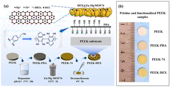 - Xiao, T.; Fan, L.; Liu, R.; Huang, X.; Wang, S.; Xiao, L.; Pang, Y.; Li, D.; Liu, J.; Min, Y. Fabrication of Dexamethasone-Loaded Dual-Metal–Organic Frameworks on Polyetheretherketone Implants with Bacteriostasis and Angiogenesis Properties for Promoting Bone Regeneration. ACS Appl. Mater. Interfaces 2021, 13, 50836–50850. [Google Scholar] [CrossRef]