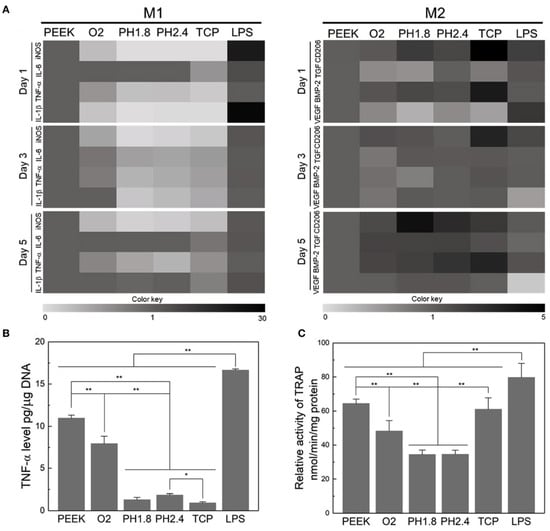Evaluating the acute inflammatory response of RAW264.7 on different samples. (A) Heat map depicting the expression of the M1- and M2-related genes based on the RT-PCR results after incubation for 1, 3, and 5 days; (B) TNF-α level in the supernatant after culturing for 3 days; (C) TRAP activity after culturing for 8 days. * p < 0.05, ** p < 0.01. Reprinted with permission from ref. [96]. Copyright 2021 Elsevier.