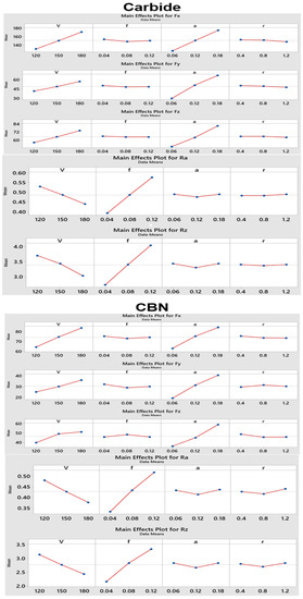 Figure 2 according to Taguchi’s “the lowest is the best” approach. According to the main effects plot, cutting depth and cutting speed have a dominant effect on the Fx, Fy, and Fz for both cutting inserts. As the value of cutting depth and cutting speed augments, the responses also increase sharply due to the removal of large amounts of material from the workpiece. Furthermore, feed rate has a superior impact on Ra and Rz, followed by cutting speed. Increasing the feed rate sharply enhances the surface roughness. In contrast, increasing the cutting speed reduces the surface roughness. It was concluded that the cutting depth and nose radius have a negligible effect on the Ra.