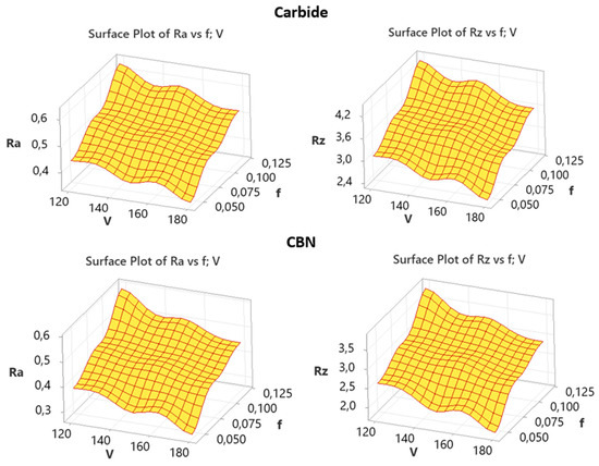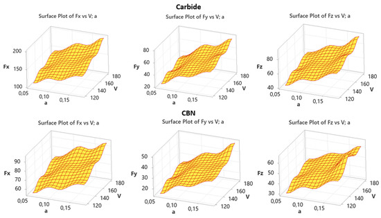 The 3D surface plot for carbide and CBN inserts considering the interaction of V-a, which is dominant on the cutting force components, is presented in