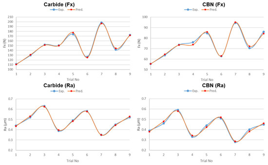 Figure 5 for Fx and Ra using both cutting inserts. Clearly, the presented model fits well with the experimental results since the values are very close.