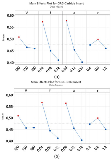 Table 8, the combination of V1-f1-a1-r2 machining parameters (V = 120 m/min, f = 0.04 mm/rev, a = 0.06 mm, r = 0.8 mm) is selected as the optimum machining parameters in both cutting inserts for the multiple-responses considering the highest mean grey relation grade, which indicates a stronger correlation to the reference sequence and better performance. The difference between the maximum and minimum GRG shows the contribution effect of the machining parameter on the multiple responses; a higher difference means a higher impact. According to