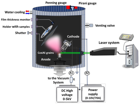 In this context, an optimal method to obtain controlled CoNi thin films with semi-hard magnetic properties is the Laser-induced Thermionic vacuum arc (LTVA) method [19]. Using this improved technology, based on the classical Thermionic vacuum arc (TVA) method [20], the laser-induced plasma modifications provide uniform intermetallic thin films with thickness up to 100 nm with smooth surface, high purity, and tailorable surface properties.