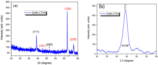 The zone between 65° and 75° degrees was arbitrarily removed to hide the XRD peaks of the Si substrate, centered at 69°. The peak from 44.28° can vary between 44.2° for a pure fcc Co structure to 44.28° in the case of Co3Ni and at 44.4° for CoNi3 [39,40].