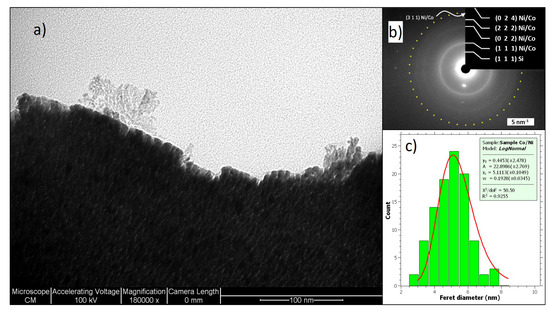 The HRTEM image shows a uniform thin film (Figure 3) with a crystallite dimension of about Lc = 5 nm, estimated using a lognormal distribution of Feret’s diameter, the algorithm implemented in the iTEM platform (right inset Figure 3). The left inset shows the electron diffraction and Miller indices for Ni or Co cubic system [41].