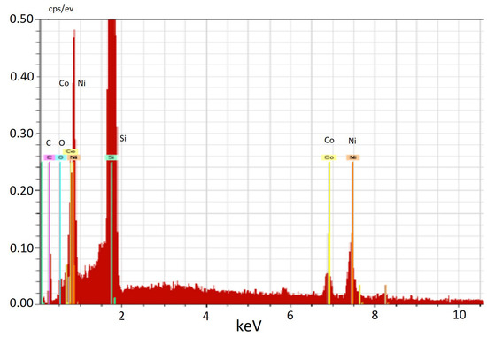 More interesting is the EDX analysis, which gives information about the composition of the deposited thin films. It also shows where the main peaks are assigned to Co, Ni, and larger Si substrate, and shows that they are accompanied by traces of oxygen and carbon K-lines (Figure 6).