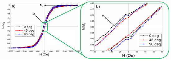 From the longitudinal MOKE measurements, the CoNi thin films with a mean thickness of about 100 nm have a coercive field of about Hc = 38–42 Oe, depending on the orientation in-plane of the sample (Figure 8b) and a saturation field of around Ms = 900 Oe. The angular dependence of the magnetization with the rotational angle indicates an isotropic magnetic thin film without specific magnetization domains, supported by the amorphous structure of the CoNi thin films.