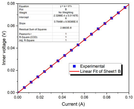 The slope of the linear dependence between the inner voltage and applied current gives the sheet resistance and, by applying Formula (3), the resistivity was estimated at = 34.16 μΩ cm.