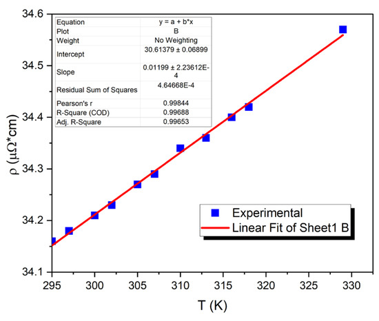 The resistivity versus applied temperature follows a linear dependence just over room temperature, given by: