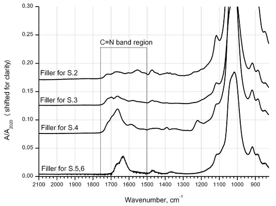 The organomineral fillers were characterized by ATR-FTIR spectroscopy (Figure 1). In the [1500–1760 cm−1] region of the spectra, groups of bands were observed to correspond to the vibrations of the carbon–nitrogen bonds in guanidine moieties of organic biocide. The precise shapes and positions of these bands were unique to each individual guanidine-derived polymer used in the study. The most intense peaks in the 1250–1000 cm−1 region corresponded to vibrations of the Si-O bonds of montmorillonite, comprising upwards of 70% of the fillers by weight.