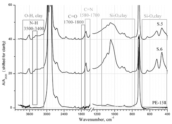 In the FTIR transmission spectra for the composite materials (Figure 2), characteristic bands of montmorillonite were also observed: 1250–1000 cm−1 and 650–400 cm−1 (Si-O), and 3100–3800 cm−1 (O-H). Bands in the 1600–1700 cm−1 region corresponded to the guanidine content of the composite and were unchanged after composite processing; the strong bands at 3000–2500 cm−1, 1500–1400 cm−1, and 750–700 cm−1 were attributed to polyethylene.
