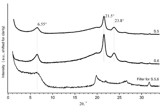 The nanostructures of the obtained composites were studied by means of X-ray diffraction analysis (Figure 3). Regardless of the type of compatibilizer used in the composites (Arquad or Metalen), the interlayer distance of the organomineral filler in composites d = 1.35 nm (calculated from the position of the basal reflection 2θ = 6.5°) remained unchanged and equal to the interlayer distance of the filler powder, indicating no intercalation of the LDPE polymer chains into the interlayer space of the filler. However, the interlayer distance of the filler was higher than the typical value for sodium montmorillonite (0.96–1.2 nm depending on the air humidity), indicating the intercalation of the guanidine-derived polymer into the MMT during the production of the organomineral fillers. The reflections at 2θ = 21.5° and 2θ = 23.8° are typical for the orthorhombic phase of LDPE.
