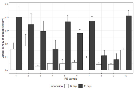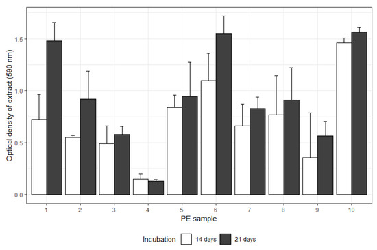 Quantitative assessment of the viability of cells within biofilm formed on the surface of PE-158 by multispecies microbial communities isolated from: PE films from compost materials (1–3); surface of PE sample forming press (4–5); PE film from landfill in Novomoskovsk city (6); extrudates incubated for 180 days in Myanmar soil (7–8); surface of a plastic vessel (9); PE samples found in the Mozhaisk reservoir (10); dyeing with MTT, extraction with DMSO.