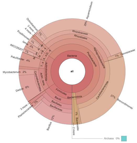 Furthermore, the phylogenetic composition of the three most actively biofilm-forming communities of microorganisms was studied. Krona diagrams are shown in Figure 6, Figure 7 and Figure 8.