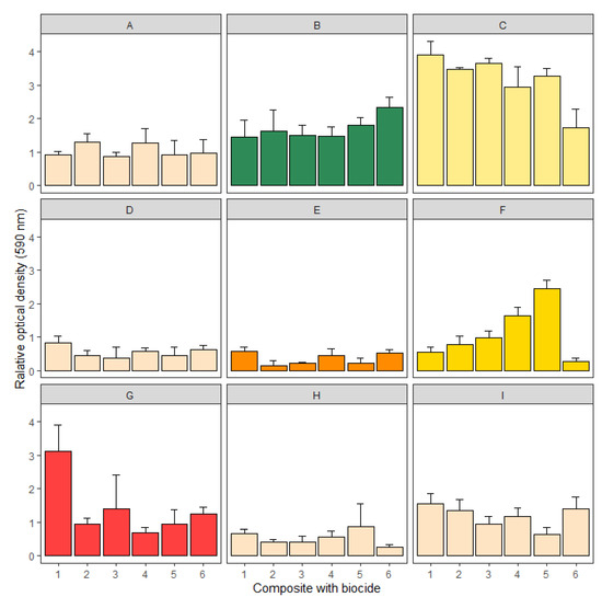 Figure 9 shows the median values of the results of the growth of monospecies biofilms of nine pure cultures on composites for 3 days (the experiment was carried out in five statistical replications). It follows from the diagrams that, in some cases, the inhibitory effect of biocides on the growth of biofilms of pure cultures was indeed present, but it depended more on the culture than on the biocide variant.