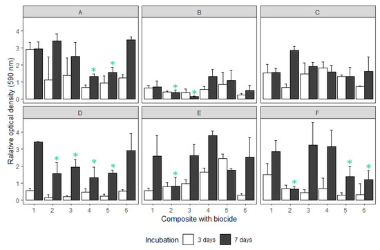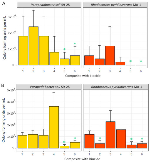 Viability of R. pyridinivorans Mo-1 and P. soli 59-25 within a binary biofilm after 3 (A) and 7 (B) days of incubation on the surface of composites protected with biocides. 1—control, without addition of biocide (S.1); 2–6—protected composites, with addition of biocide (S.2-S.6 in Table 1). Dyed with MTT and DMSO extraction. Significant values are marked with green asterisks (p < 0.05).