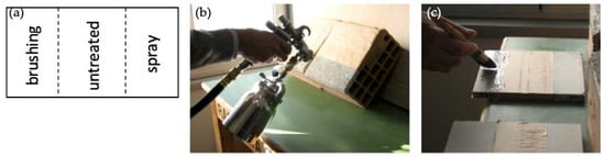 (a) Scheme of the different treatments applied over each specimen; (b) spraying of the TiO2 suspension on a render specimen (the brick used as substrate can be seen too); (c) brushing of the TiO2 suspension on a board specimen.