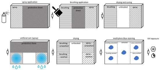 Two methods of application of the TiO2 suspension were used: brushing (4 brush strokes) and high-volume low-pressure spray (0.7 bar, distance between nozzle and sample was ~15 cm). Each specimen was treated by brushing on approximately one third of the surface and by spraying on another third, leaving the remaining third (at the center) untreated for comparison, according to the scheme in Figure 1a. The spraying and brushing applications were carried out covering the adjacent parts with a sheet, as shown in Figure 1b,c, respectively. Notably, spraying was carried out after covering the remaining part of the samples (Figure 1b) and then the brushing was carried out after covering the untreated part only (Figure 1c). In this way, the areas of the samples already treated with TiO2 were not altered by the application of any covering. After the treatments’ application, the specimens were left to dry for one week in laboratory conditions (temperature 20 ± 2 °C, relative humidity 55% ± 5%) after the application of the suspension, before any testing.
