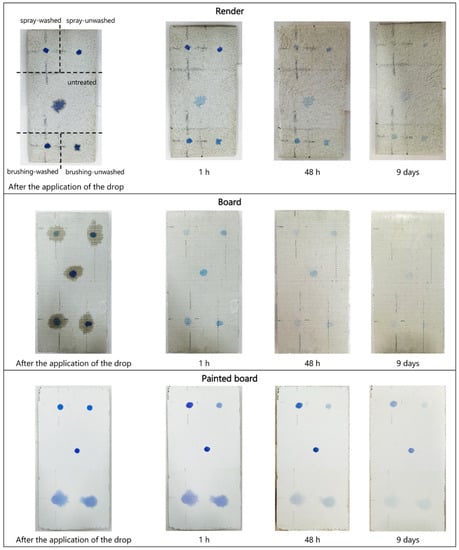 The aspect of the blue drop immediately after its release on the surface (Figure 4 on the right) was different in the three substrates, because their porosity was clearly not the same and caused a different absorption of the drop. In the render sample, the drop spread quite a lot in the untreated zone, due to the high porosity of the substrate, but the colorant was retained at the center while the water was further absorbed by the substrate (dark wet zone around the blue stain in the picture). In all the treated zones of the render sample, the drop spread much less. Considering that the aqueous nano-TiO2 dispersion is expected not to have any pore-blocking effects due to its low concentration and to cause, if anything, an increase in surface wettability, this effect can be ascribed to the primers used before the nanodispersion application and in particular to coating#1, which decreased the surface capillary absorption of the material (it is defined as a ‘porosity reducer’ in the technical datasheet by the manufacturer). In the board sample, the drop spread quite a lot in both the treated and untreated zones, due to the porosity and hydrophilicity of the substrate (with a contact angle of 45.3°), and again the colorant was retained by the material, while the solvent was further absorbed by the substrate. Here, the primer apparently had no significant impact on the capillary absorption of the surface, and in fact, only coating#2 (coupling agent without a porosity reduction effect) was used, and it caused just a slight increase in the contact angle compared to that of the untreated zone.