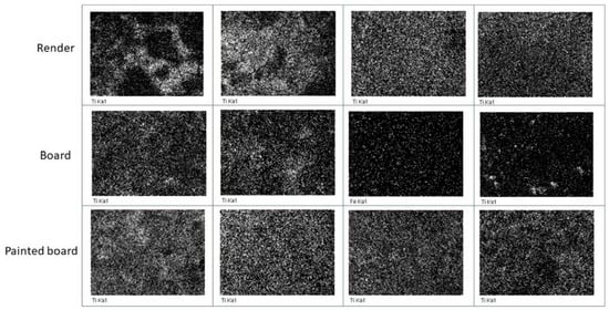 The amounts of TiO2 found on the samples by EDS are reported in Table 2, while some representative EDS maps of the Ti distribution on the samples’ surfaces are reported in Figure 5. Although the areas investigated are quite small and there is a certain scattering of data, the results allow us to make some observations. The EDS analysis did not detect any Ti presence in the untreated render and board samples, as expected, while abundant Ti was found on the painted board, likely owing to the rutile pigment in the paint. After the application of the coating, the following observations were made.