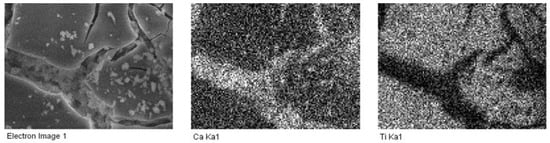 Board sample treated by spraying after washing: details of the surface observed on SEM and EDS maps (Ca and Ti) of the same surface (size: 60 μm × 90 μm).