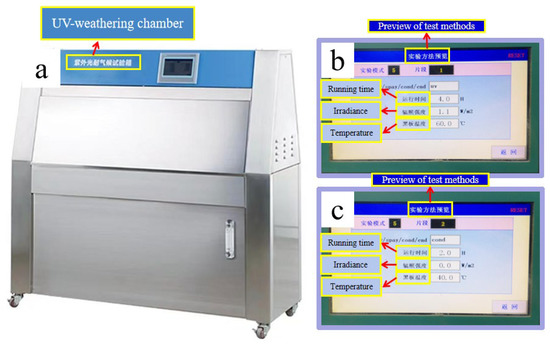 (a) UV-weathering chamber; (b) testing program in mode 1; (c) testing program in mode 2.
