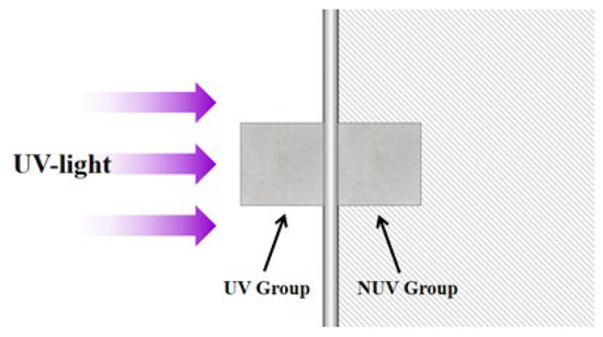 To exclude interference from other environmental factors and to compare the effects of UV radiation, reference group (denoted as the UV group) samples were set up and placed inside the test chamber along with the experimental group (denoted as the NUV group). As shown in Figure 4, the UV group and the NUV group were placed in different areas of the same chamber to maintain the same temperature, humidity, and CO2 concentration conditions. The difference was that the UV group was placed inside a metal plate and exposed to direct UV radiation during daylight mode, whereas the NUV group was placed on the opposite side of the metal plate and was never illuminated with UV light.