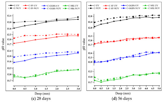The apparent pH values of the samples retrieved from different depths of the four different pastes (C, C-SF, C-GGBS, and C-MK; see Table 2) were measured after curing with or without UV radiation for 7, 14, 28, and 56 d, using the method described in Section 2.3, and the pH variation trend is shown in Figure 6. The apparent pH can effectively reflect the change in the degree of carbonation because the carbonation reaction consumes portlandite and other alkaline hydration products, causing a decrease in the alkalinity of the pore solution [25,26].