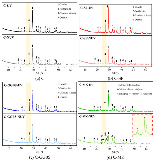 XRD patterns of samples after 28 d of curing with and without UV radiation.